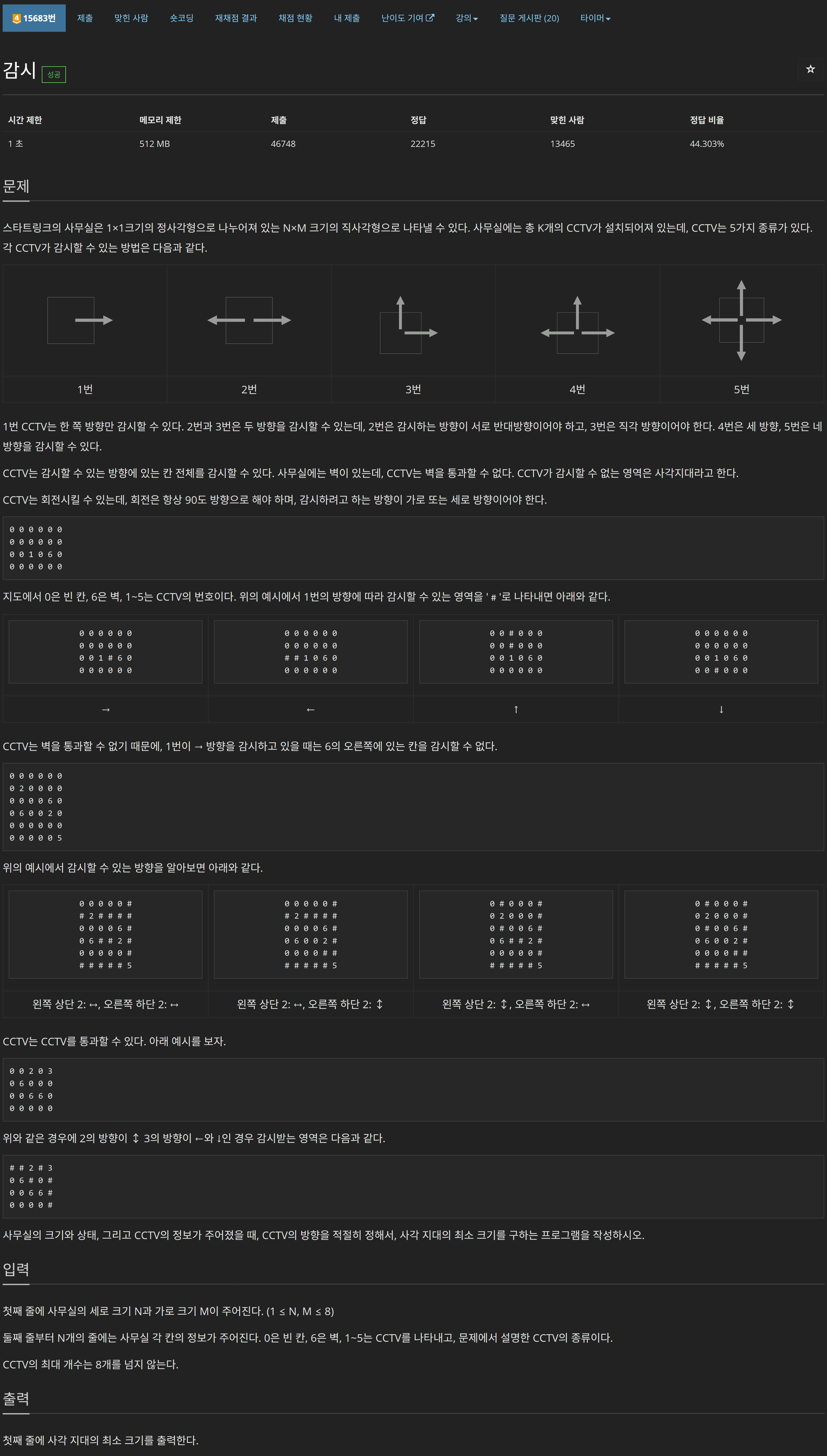 예제가 굉장히 많아 백준에서 참고하시길 바랍니다. 주의할 점은 백준의 test case에는 4번 cctv에 대한 검증이 부족하므로 개인적으로 테스트해볼 것을 추천합니다.