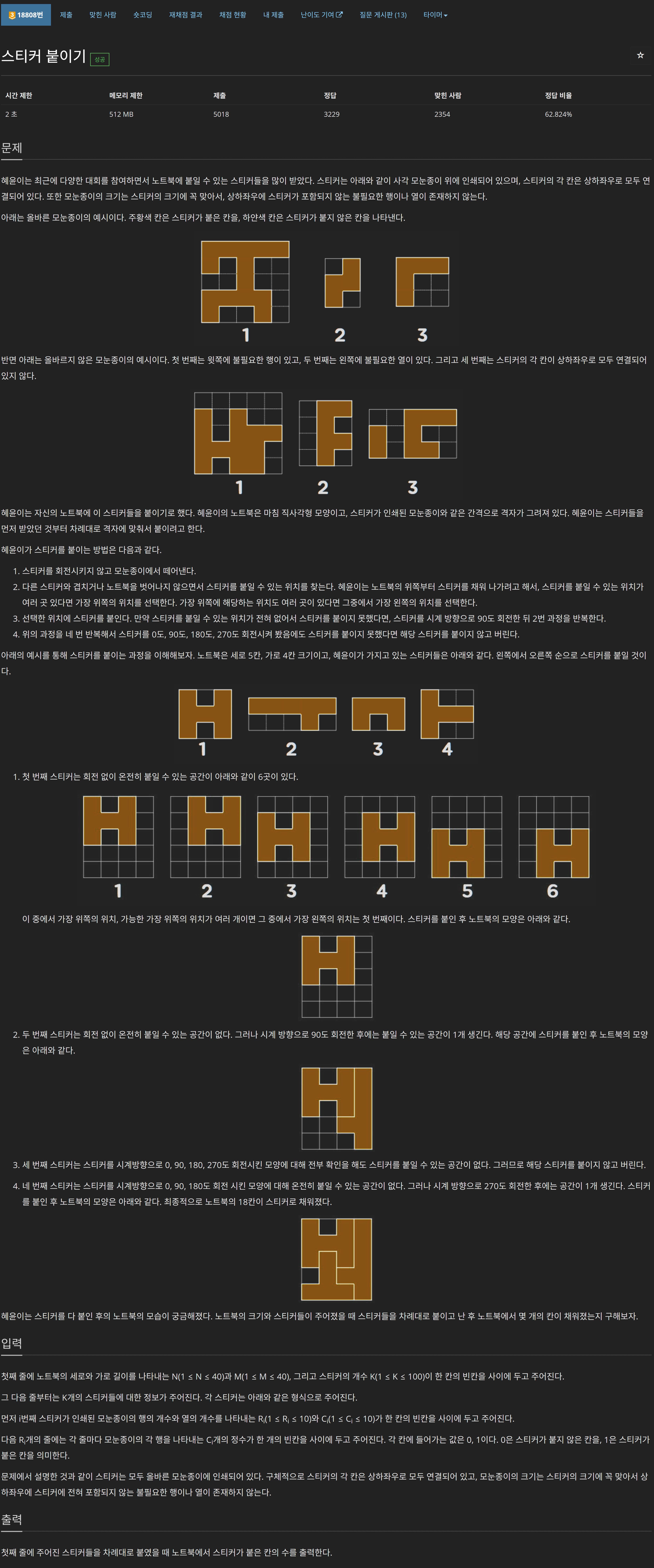 스티커를 붙이는 게 가장 중요해 보이는데, 여기서 시간 복잡도가 결정될 것 같다. 가장 먼저 생각난 풀이는 모든 칸에 붙이려는 스티커 (0, 0)을 붙여보고 안되면 회전시키는 방식이다. 먼저 시간을 계산해 보고 괜찮을지 판단했다.