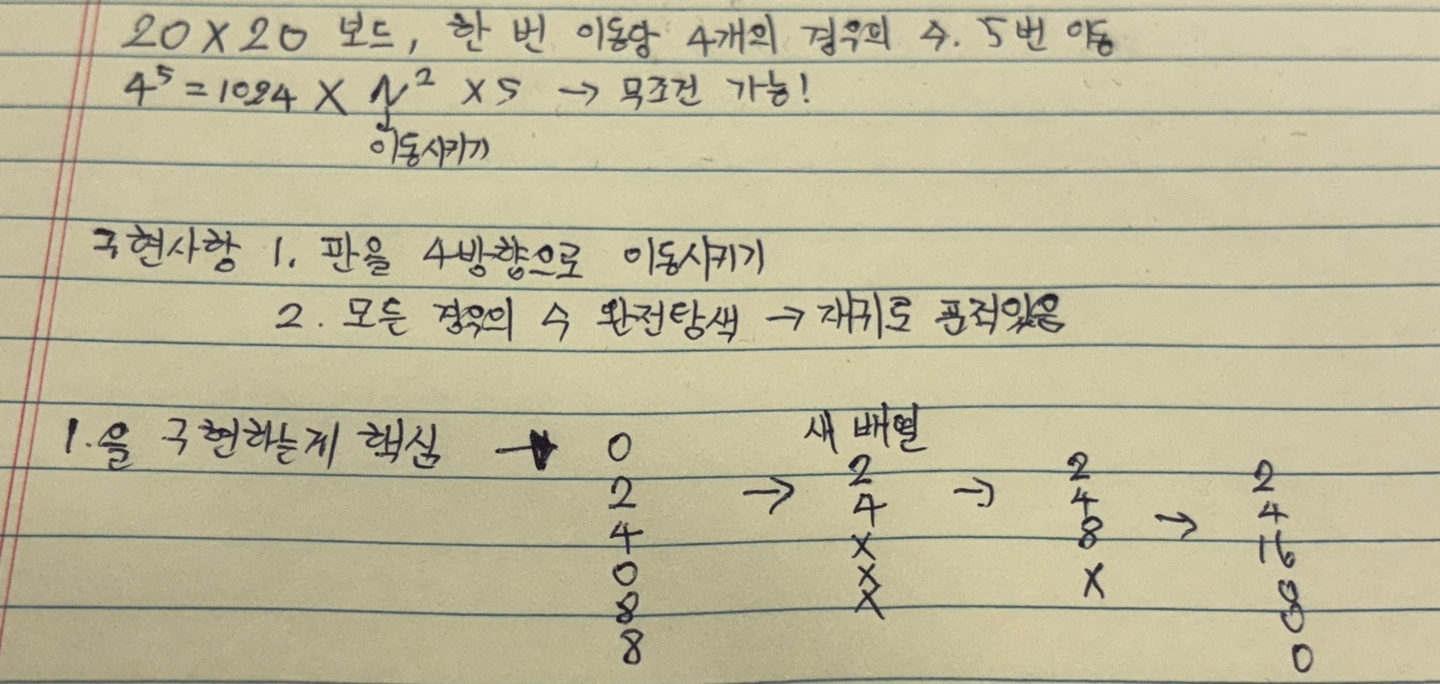 20*20 크기의 보드에 한 번 이동당 최대 4개의 경우의 수가 있으므로 총 1024개의 보드를 탐색하면 된다. 1024개에 대해 보드를 이동시키는데 N^2 만큼의 시간이 든다고 가정하면 총 시간복잡도는 1024 * N^2 * 5이므로 무조건 가능하다고 생각하고 완전탐색으로 풀이 방향을 잡았다.