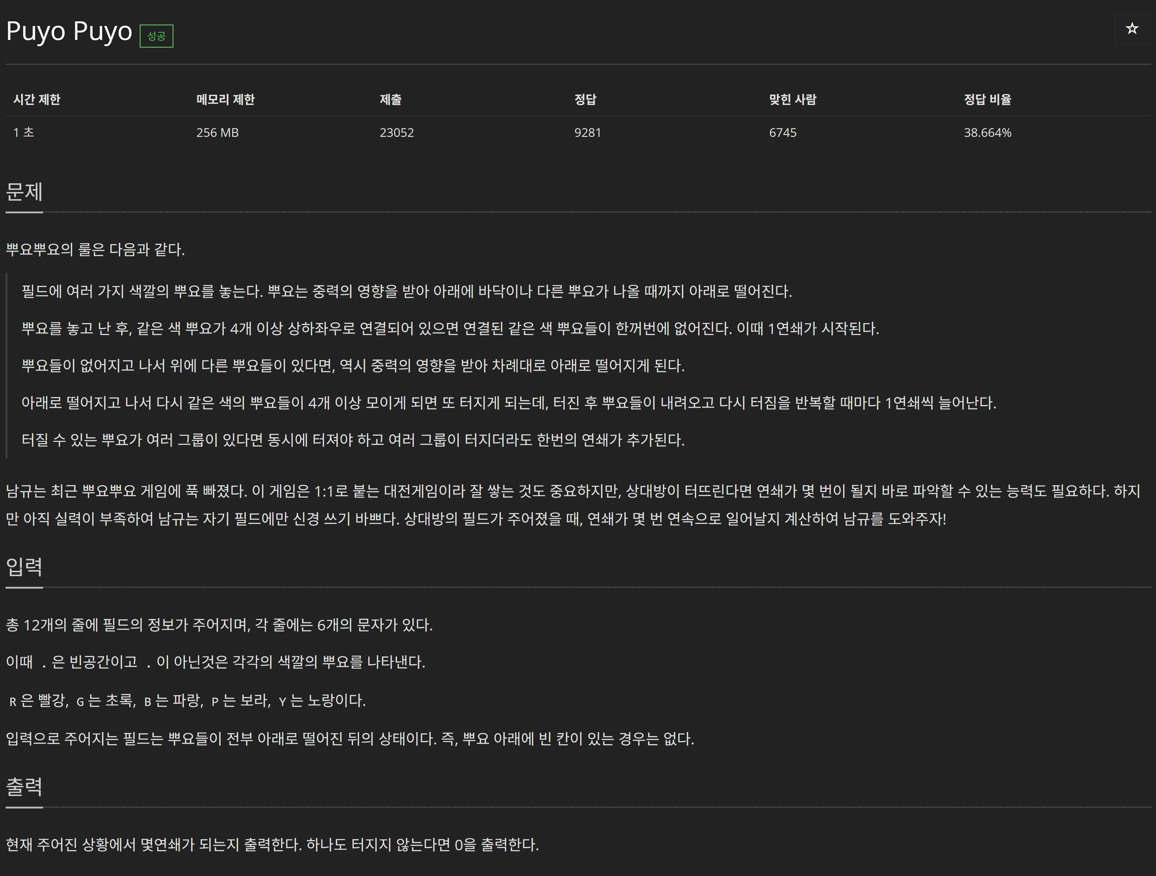 총 12개의 줄에 필드의 정보가 주어지며, 각 줄에는 6개의 문자가 있다. 이때 .은 빈공간이고 .이 아닌것은 각각의 색깔의 뿌요를 나타낸다. R은 빨강, G는 초록, B는 파랑, P는 보라, Y는 노랑이다.