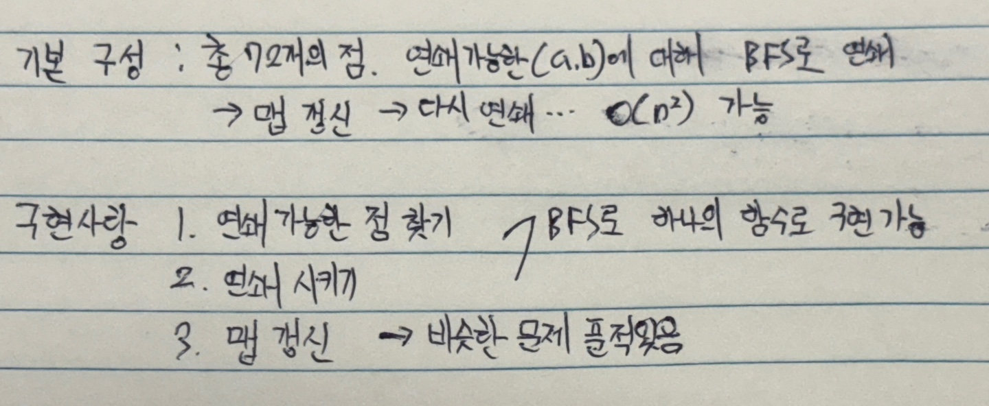 1, 2번은 BFS 하나의 함수로 구현이 가능할 것 같다. 일단 따로 구현할 생각을 하고 (a, b)의 점이 연쇄 가능한지 판단하는 것부터 구현해 보자. - 맵 갱신