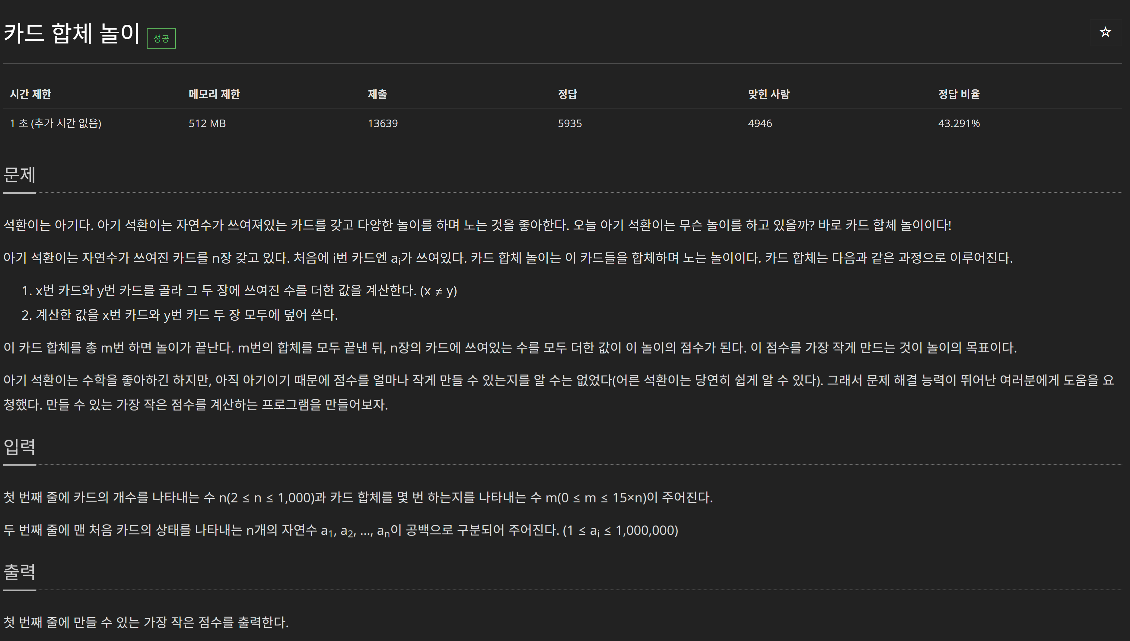 여기까지는 쉬웠지만 주의할 점이 하나 있었다. n개의 카드가 최대 1,000개이고 15 * n번의 턴이 진행되며 각 카드의 숫자는 최대 1,000,000여서 int 자료형으로 구현하게 되면 오버플로우가 발생한다. 따라서 모든 자료형을 long long으로 바꿔주었다. 자료형을 long long으로 바꿀 때 연산 과정에서 일부 int가 섞여있으면 계산에 오류가 발생할 수 있으므로 콤팩트하게 다 바꿔주자.